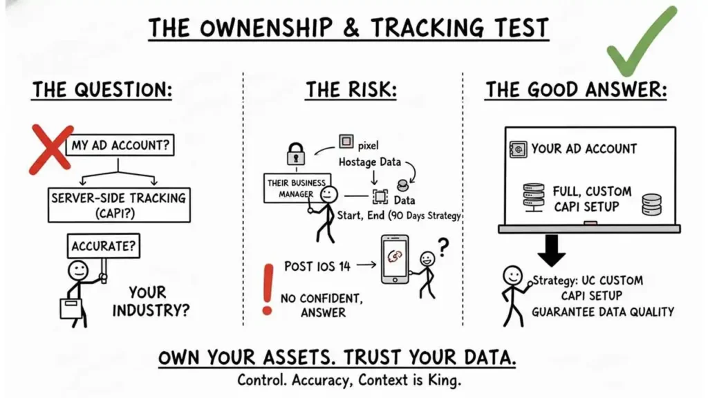 Agencies that insist on running your ads through their Business Manager are a major red flag—they hold your data, pixel history, and audience history hostage if you ever leave. Furthermore, post-iOS 14 performance relies entirely on accurate server-side tracking (Conversions API, or CAPI). If they don’t have a confident, technical answer here, your data will be inaccurate.