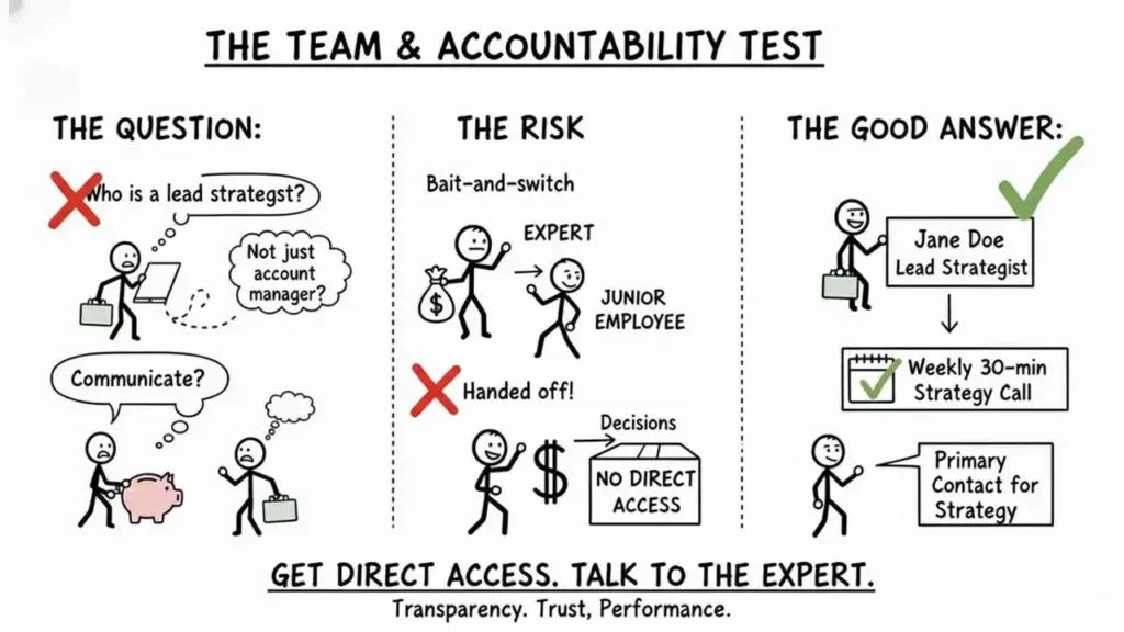 This avoids the common “bait-and-switch.” You are sold on the agency by the expert (the founder or lead strategist), but once you sign, you’re handed off to a junior employee. You need direct access to the person making the critical decisions on your budget.